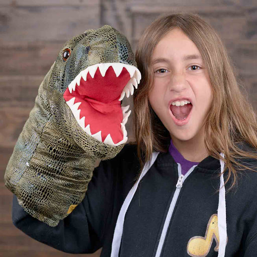 The Puppet CompanyAmazing irridescent scaley material and jaws full of teeth, this T-Rex Large Dino Head is a real show stopper. With full working mouth and excell...